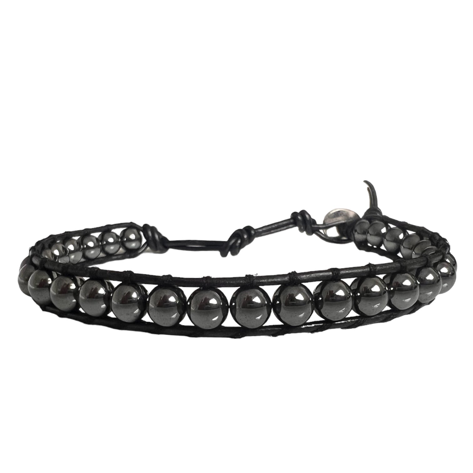 This stylish single wrap bracelet is handcrafted Hematite stones on genuine leather and fastens with an engraved Da Costa button. Pair with a simple hand-knotted necklace to complete the look.