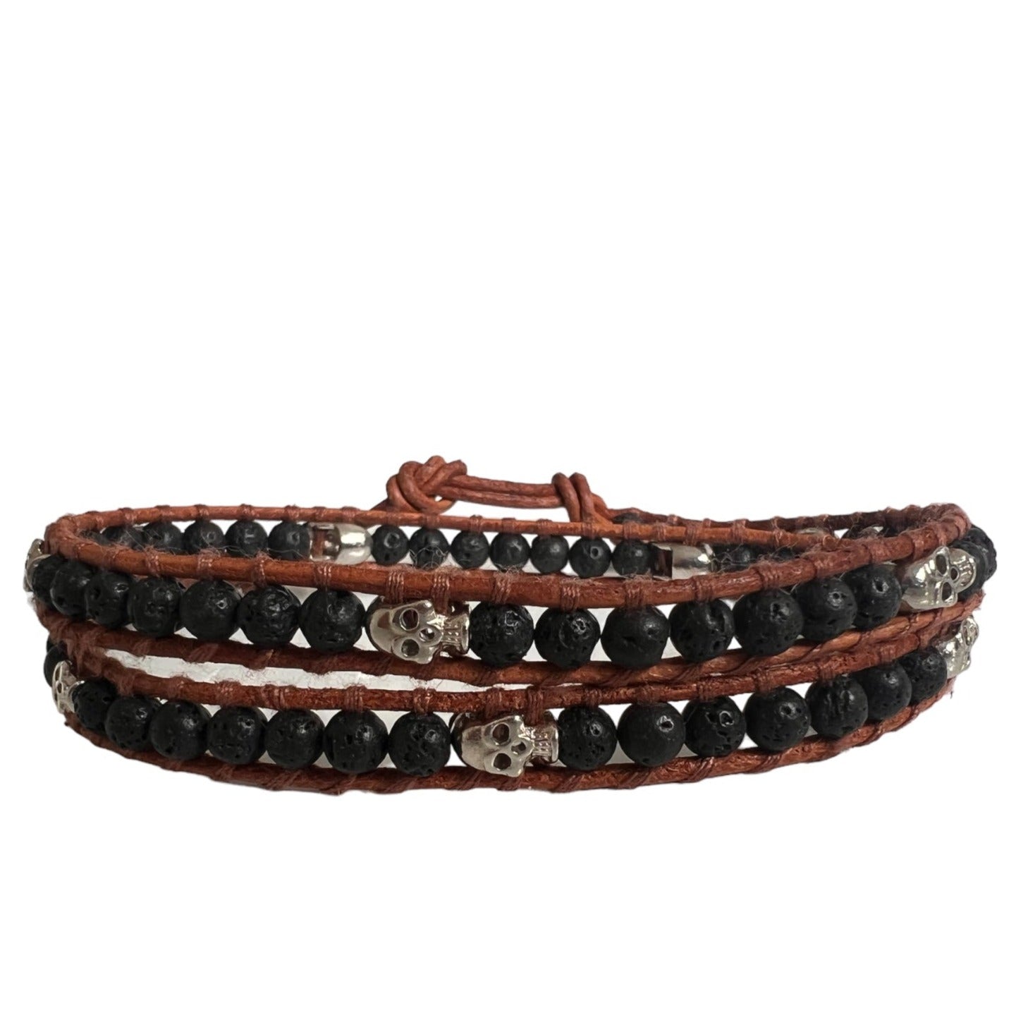This stylish double wrap bracelet is handcrafted with Lava stones on grey genuine leather and fastens with an engraved Da Costa button. Pair with a simple hand-knotted necklace to complete the look.